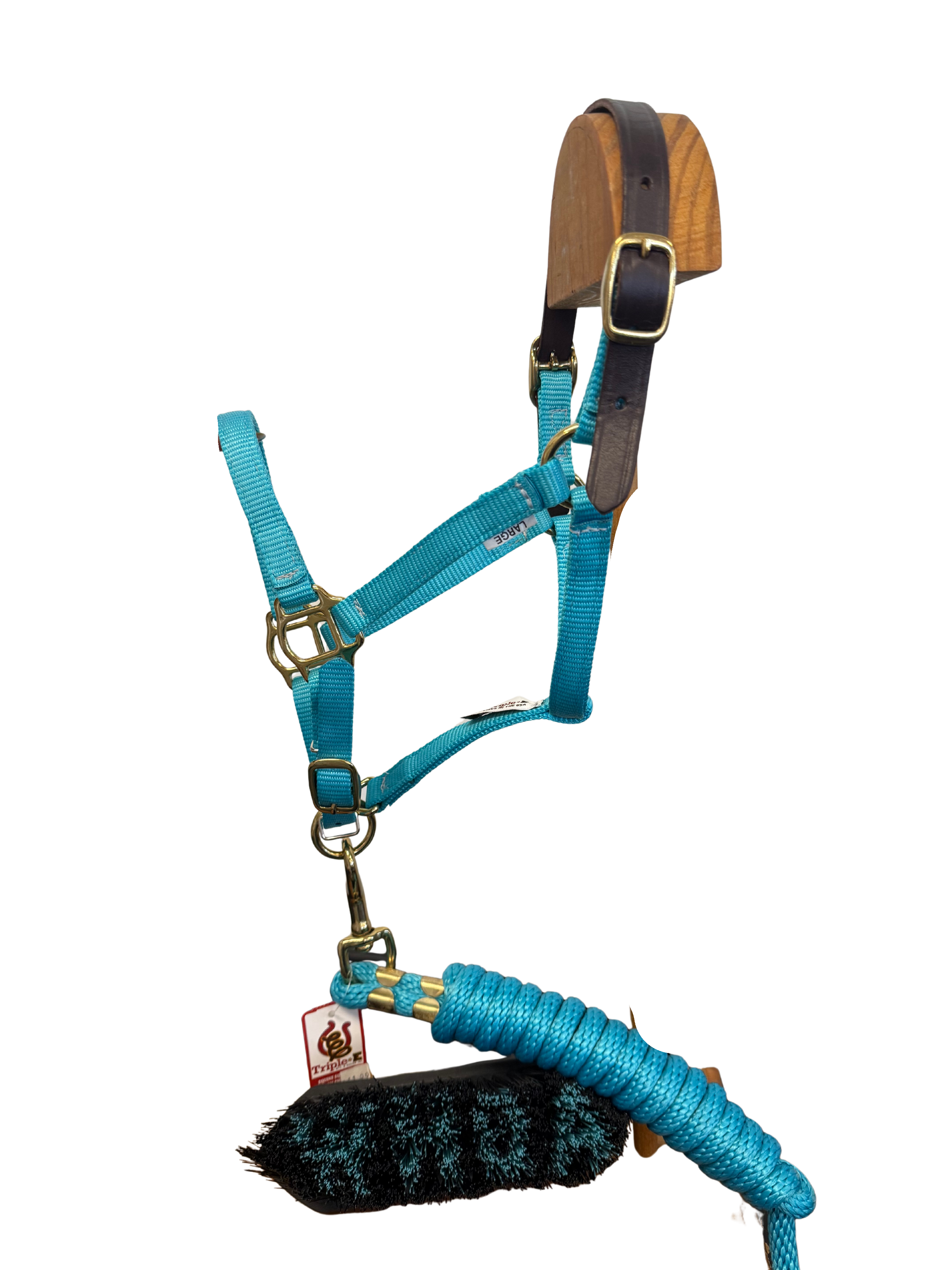 Large size Miniature horse halter with safetly leather breakaway crown, matching turquoise polyester lead rope and medium bristle brush
