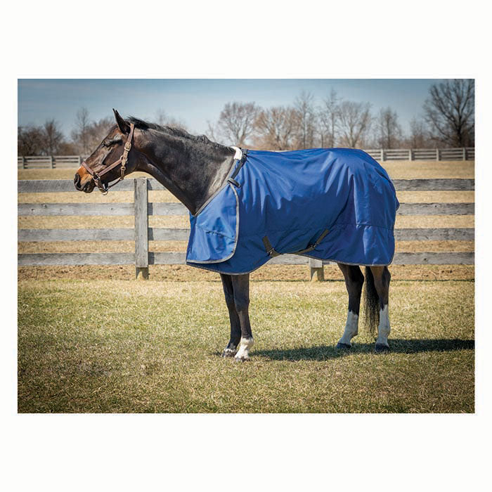Unique HUG Closure system wraps around the front of the horse preventing shoulder rubs and discomfort. Extremely durable 2520 Denier fabric is waterproof and breathable. Your horse will thank you for giving them a HUG! Includes bias surcingles, removable leg straps and tail flap. Cobalt Blue with Grey Trim.